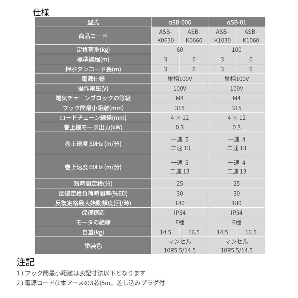 象印 αSB型 懸垂式小型電気チェーンブロック αSB-01 100kg 揚程3m 二速型 1105-ASB-K1030