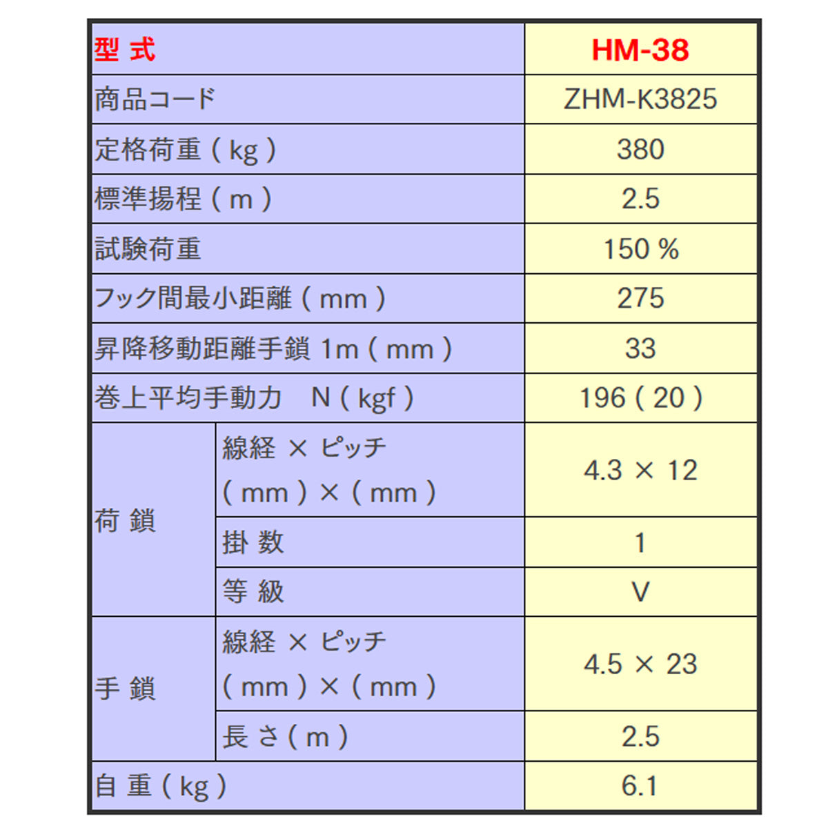 象印 チェーンブロック HM型 ホイストマン HM-38 380kg 揚程2.5m 1111-ZHM-K3860